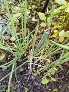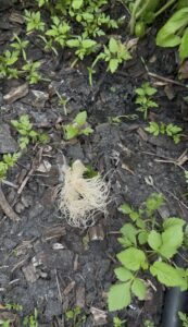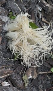 「カビが生えたのかな」と思いながらよく見ると、ネギの束が逆を向いて植えられ、根っこが飛び出していたのです。