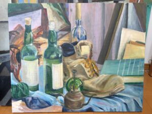 作品は青を基調としており、ワインボトルや紐靴、注ぎ口のついた小さな容器、糸玉、本などが並んでいます。