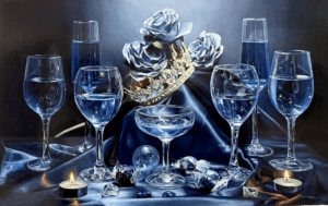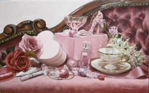 続いて、13年後に描いた2枚目の作品は、ピンク系で統一されながらも単調にならず、バラや宝石、ガラス器のきらめきによって、華やかさと奥行きが生まれています。