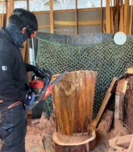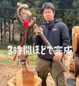 挑戦したのは、丸太から杖を作り上げるチェンソーアート。大きな丸太をチェンソーで削り出し、杖の形に整えていきます。完成までにかかった時間は3時間ほどでした。