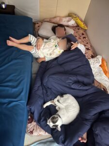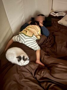 パパさんは「娘は最近、眠くなると親の体をベッドにしたがりますし、うめも私の足の上で寝るのが好きなのです。娘とうめに乗られて身動きが取れないまま、私も寝落ちしてしまいました」と振り返ります。