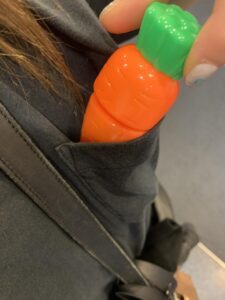 何かを入れた記憶がなかったため、不思議に思いながらジャケットを脱ぎ、恐る恐るポケットに手を入れてみると…出てきたのは、ニンジンの形をしたおもちゃでした。