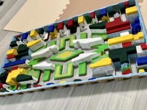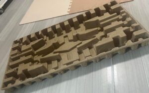 今回ママさんが作ったのは、段ボールでできた“街”。なにかの部品が入っていた段ボールに色を塗り、くぼんだ部分を道に見立ててミニカーを置いています。